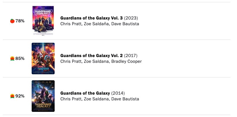 로튼토마토에서의 평점은 다음과 같습니다. 1편이 92%로 여전히 가장 높고 3편은 78%로 가장 떨어지는 것을 볼 수 있습니다.