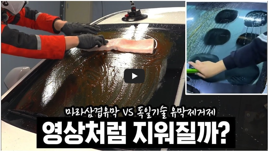 - 유막으로 뿌연 유리에 물을 뿌리고 제품을 도포.