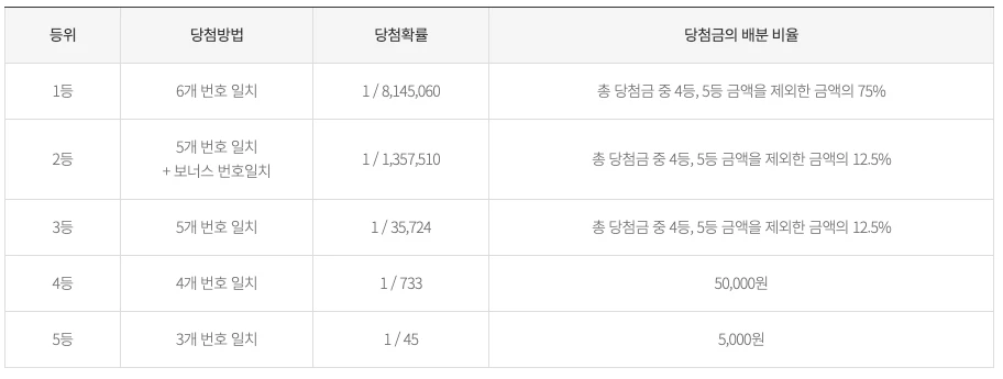 • 총 당첨금은 로또 전체 판매액의 50%이며, 42% 이상은 복권기금으로 활용됩니다.