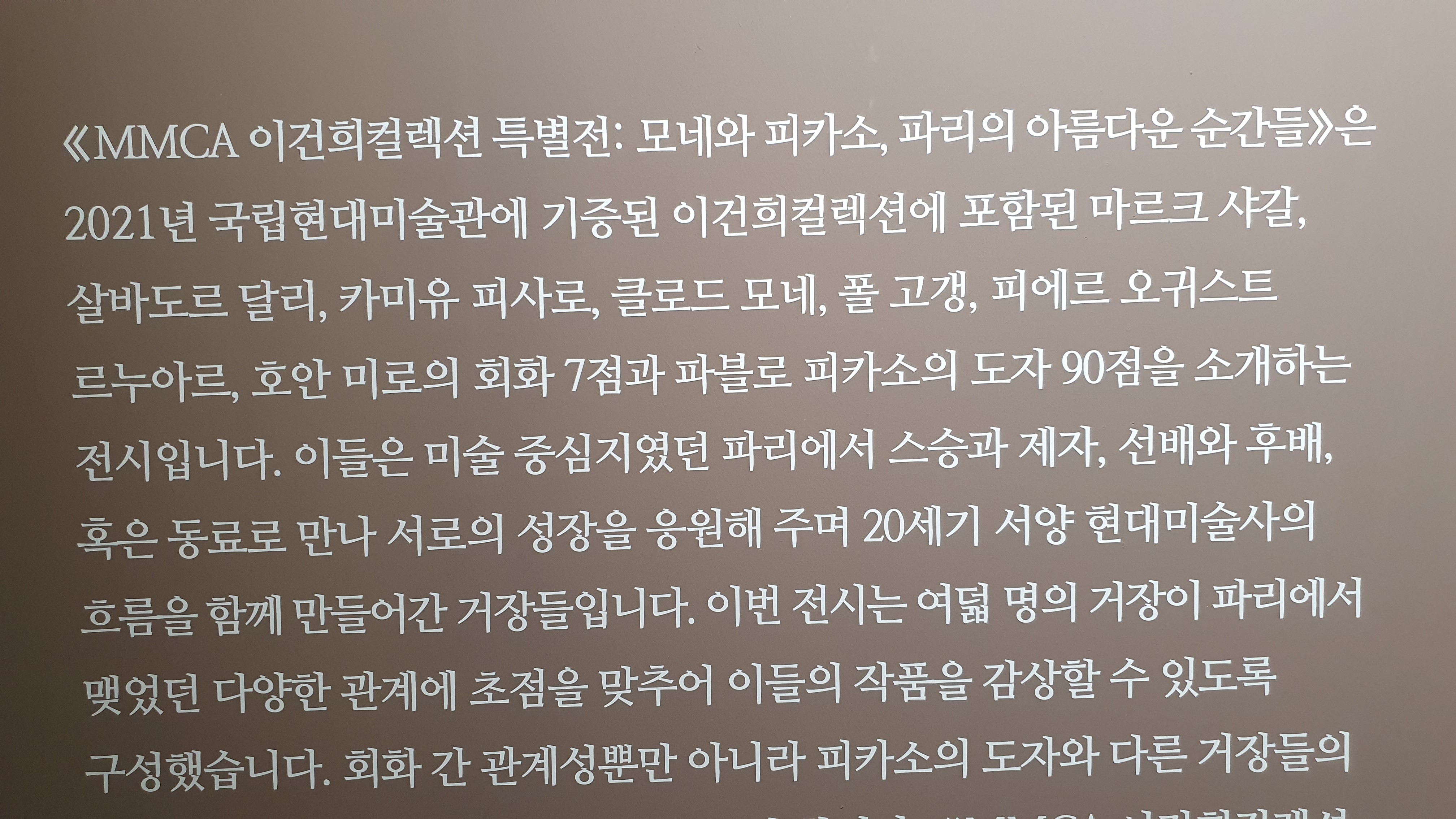 #1. 전시 서문 «MMCA 이건희컬렉션 특별전: 모네와 피카소, 파리의 아름다운 순간들» 전시회를 찾아주신 관람객 여러분, 반갑습니다. 이번 전시에서는 2021년 국립현대미술관에 기증된 이건희컬렉