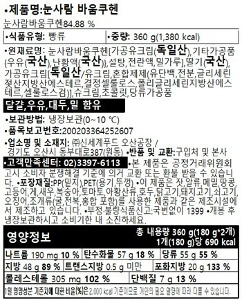 위 캡쳐는 눈사람 바움쿠헨의 영양정보입니다. 맨위에 중량은 360g이고 칼로리는 1,380kcal로 정확하게 표기되어 있습니다.