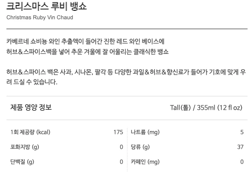 - 크리스마스 루비 뱅쇼는 무알코올 음료이며 카페인을 함유하고 있지 않습니다.
