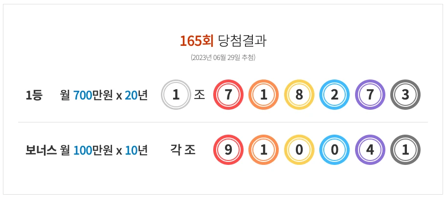 연금복권720+는 2등 당첨번호가 1등 당첨번호와 조만 다른 번호로 동일한 번호의 5개 조를 모두 구매 시 1등과 2등 동시에 당첨되는 큰 행운의 기회가 있습니다.
