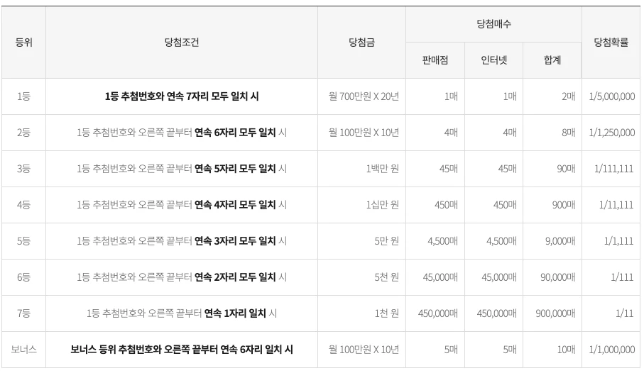 동일한 번호로 5개 조 모두 구매 시 1등(매 월 700만원씩 20년) + 2등 4매(매 월 100만원씩 10년) 동시 당첨 가능합니다.