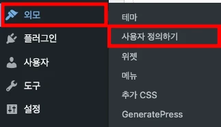 워드프레스 관리자 > 외모 > 사용자 정의하기 메뉴로 들어갑니다.