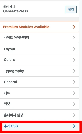 사용자 정의하기 > 추가 CSS 항목을 선택 후 아래 코드를 추가해 주세요.