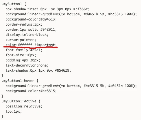 코드 가운데쯤에 붉은색 밑줄 친 부분을 참고하세요. !important를 추가합니다. 이렇게 하지 않으면 버튼의 텍스트 색상이 내가 디자인한 것과 다르게 나올 수 있습니다. 링크가 걸린 텍스트를 다른 색으로 표시해 주는 원래 기능을 제한하는 방법입니다.