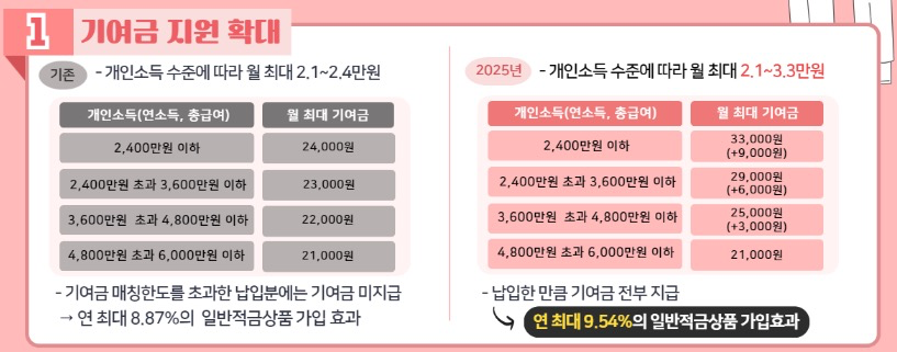 2025년부터는 모든 소득 구간에서 월 70만 원까지 기여금 지원 가능 합니다.