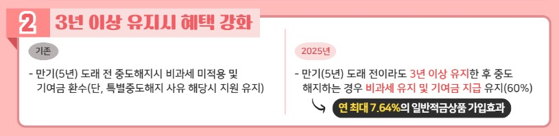 · 3년 이상 유지 시 비과세 & 기여금 혜택 부여